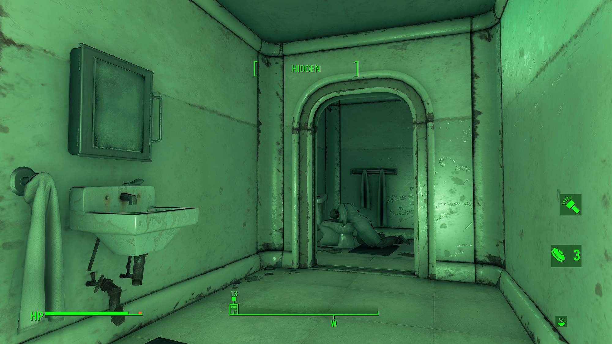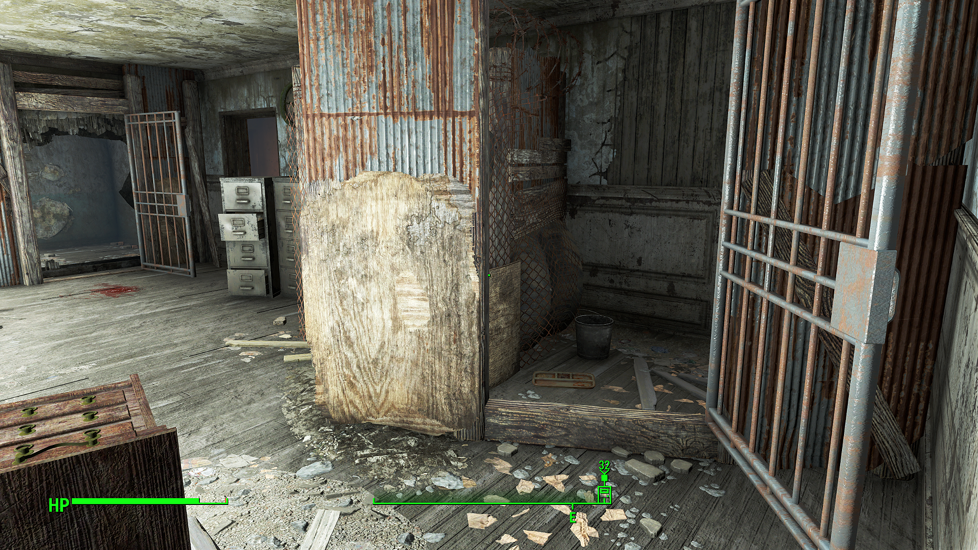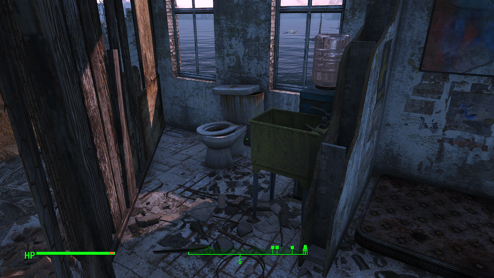 If you collect pre-war tech, you’re definitely going to want to get your hands on Drinkin’ Buddy. He’s Teddy Ruxpin with a fatty liver. You can find him at the Shamrock Taphouse at Boston Harbor where he is being unappreciated by illiterate, greasy thugs. On your way to rescue your new best friend, you’ll find these shitters. The men’s room has been refitted as a sculpture garden with a sort of frat house-style, makeshift bar and is protected by an explosive device. Since there are no ladies for miles, the ladies room has been repurposed as a bunk for this singular “lucky” loser. It is conveniently shituated (typo and I’m keeping it), but it hasn’t seen bleach in two bennies and this whole place is crumbling into splinters.