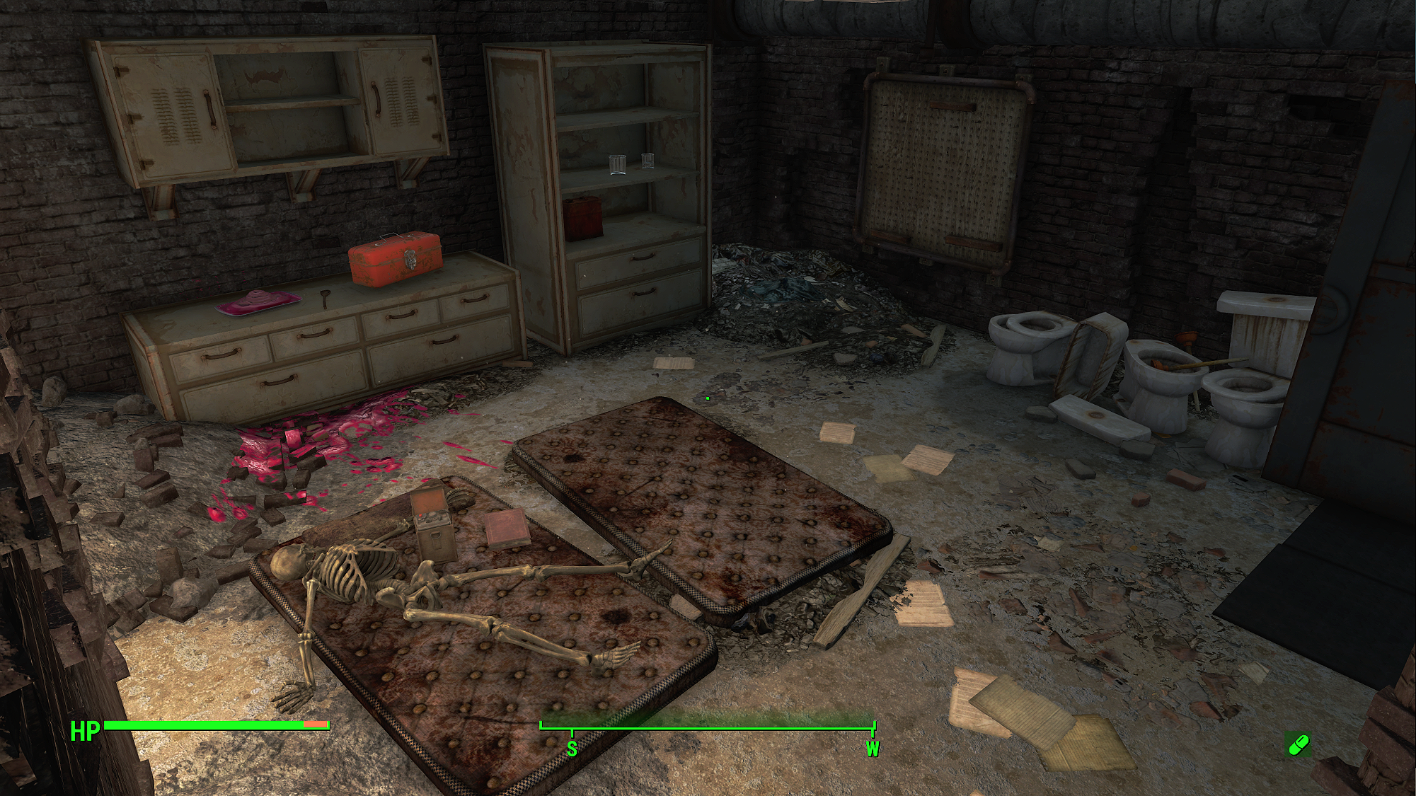 Yes, I know these bowls aren’t hooked up to anything, but this is the best you’re gonna get at the Suffolk County Charter School. I don’t know who this skeleton was who thought hiding down here was the best course of action, but at least he had 3 shitters to keep him company while waiting around to become bones, not using that Stealth Boy to actually leave and get to real safety. Perchance he was a student! Or, simply could not get enough of that perfectly seasoned pink goo, part of Vault-Tec’s Nutritional Alternative Paste Program! Num num num!